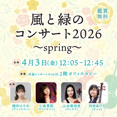 弦楽四重奏を赤坂インターシティAIRにて開催いたします。ランチタイムのひとときに、美しく優雅なハーモニーを、ぜひお楽しみください。