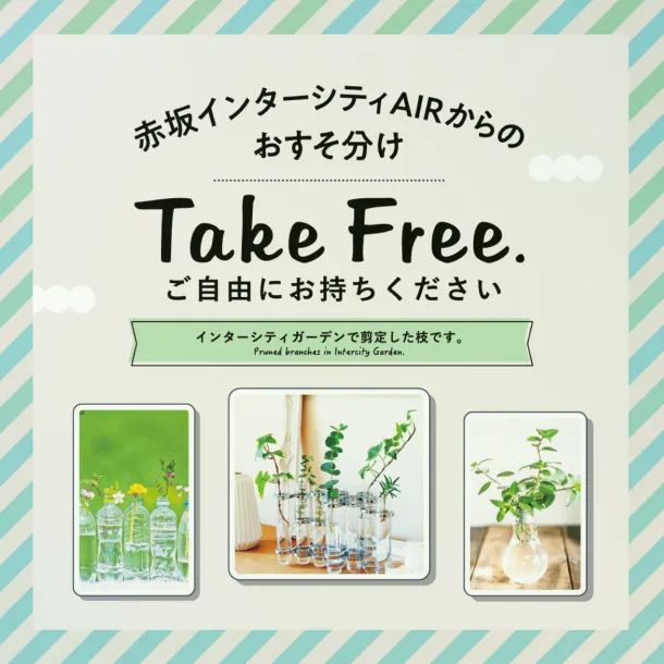 毎月第二水曜日、赤坂インターシティAIRにて緑地のお手入れで剪定した枝をご自由にお持ち帰りいただけます。2階オフィスラウンジへぜひお立ち寄りいただき、ご自宅でもAIRの緑をお楽しみください。