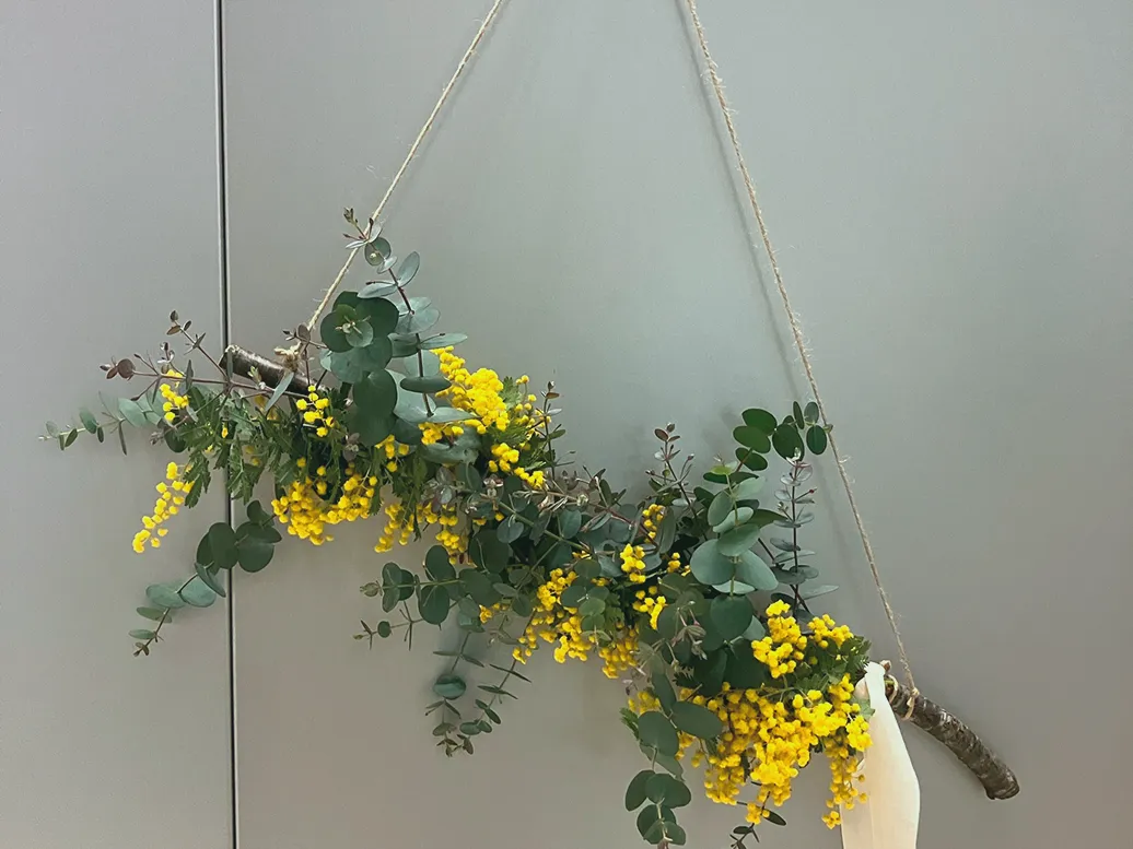 ウォールハングは、土台となる枝に、麻ひもなどの自然な素材でミモザやユーカリなどを括り付け、皆さん真剣にじっくり作っていました。